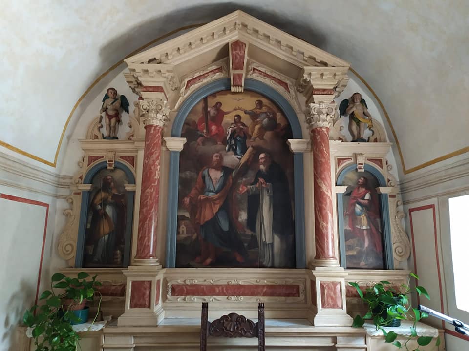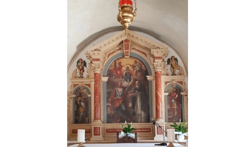 Importanti sono i dipinti su tela che dominano l’altare maggiore, posti in una elaborata cornice lignea decorata con 2 angioletti, opere del pittore austriaco Mathias Grempsel (Graz, 1650 circa – Cison di Valmarino, 1708), probabilmente di fine Seicento – inizio Settecento e restaurati nel 1999.