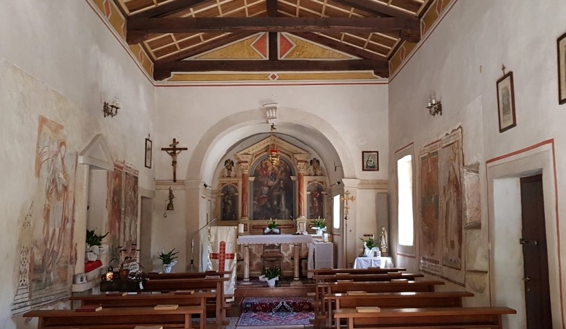 Tra gli elementi originali della chiesetta, spiccano sulla parete destra gli affreschi raffigurati Santa Margherita e Sant’Agostino risalenti al 1474, come indicato nel dipinto. Non è invece certa la data degli affreschi sulla parete sinistra, dove lo stile è differente e dove sono San Rocco, la Madonna con il Bambino e San Floriano.