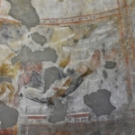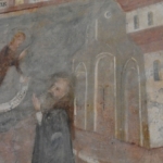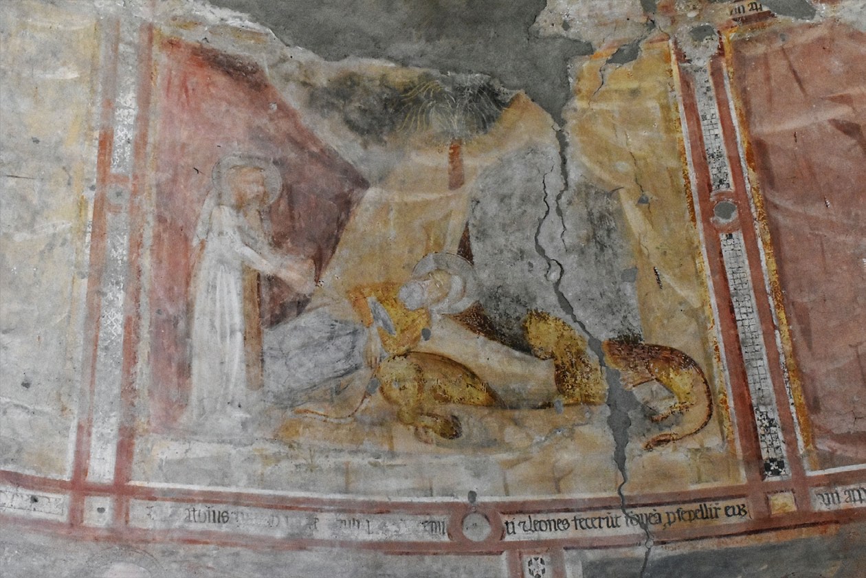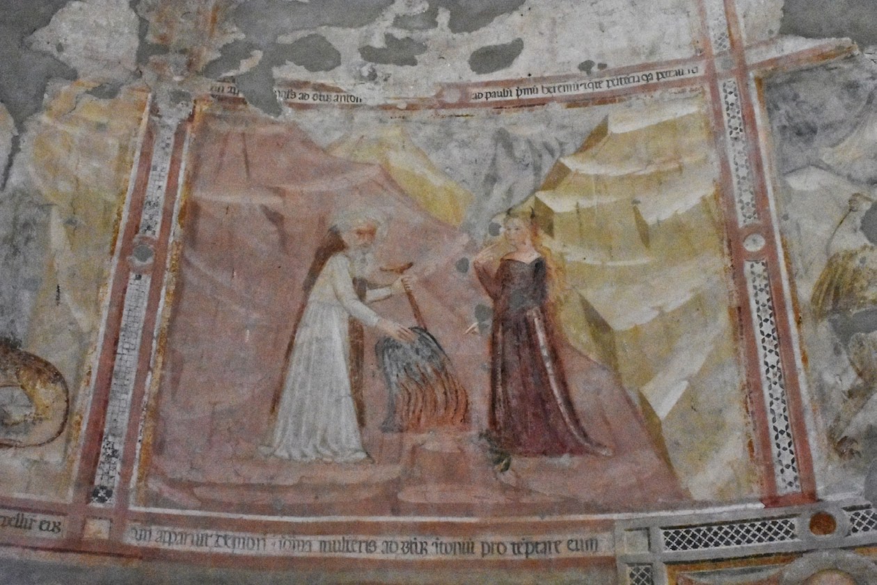 Gli affreschi del secondo registro sono persi, ma le due scene all’estrema destra dovevano rappresentare una l’incontro tra Antonio e Paolo, definito dai pochi frammenti superstiti della didascalia “primo eremita”, e l’altra, per le sagome incise sull’intonaco, il corvo che porta il pane ai due Santi.