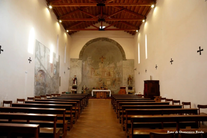 Nessuno degli affreschi che decoravano la navata rettangolare, si è conservato, invece rimangono ampie tracce della decorazione dell’abside affrescata da uno o più pittori di sicura ascendenza giottesca (forse la stessa che operò a Sant’Angelo di Alife, vedi scheda) con episodi della vita del Santo che si sviluppano secondo uno schema narrativo a riquadri che procede dall’alto verso il basso e da sinistra a destra, ed ogni riquadro è delimitato da un elegante decoro geometrico che richiama analoghi decori presenti in chiese umbre e toscane. Nella parte bassa di ogni riquadro è presente una scritta che descrive la scena.