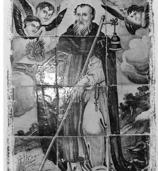 Sant’Antonio abate, circondato da cherubini, con la tau sul mantello e rosario alla cintura, tiene nella mano destra un libro sul quale è una fiamma e nella sinistra il bastone cui è legata la campanella blu e gialla. Lo sfondo è azzurro nella parte superiore e verde e giallo in quella inferiore.