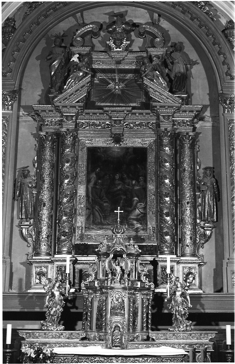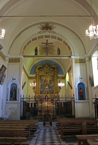L’interno, che presenta superfici ornate a rilievo e pitture murali, è a navata unica culminante nel presbiterio a pianta rettangolare. Contiene opere della bottega dell’intagliatore Gian Domenico Ramus, come l’elaborato altare maggiore, del 1685-90.