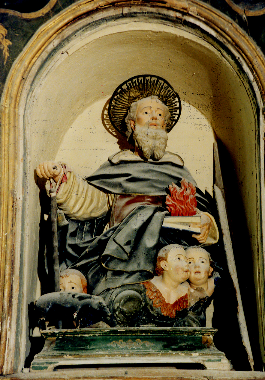 Il Santo è raffigurato seduto, con il bastone a Tau nella mano destra e nella sinistra il libro su cui è una fiamma. Ai suoi piedi testine di angioletti (?) e un porcellino.