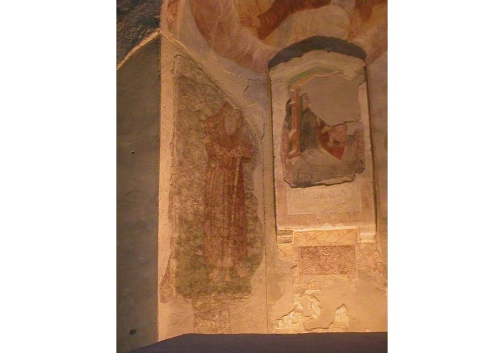 Nell’ampia cripta a 9 navate su 28 colonne, provenienti anch’essi da edifici romani e reggenti volte a crociera, un’absidiola con Madonna tra Santi (fra cui un Sant’Antonio Abate).