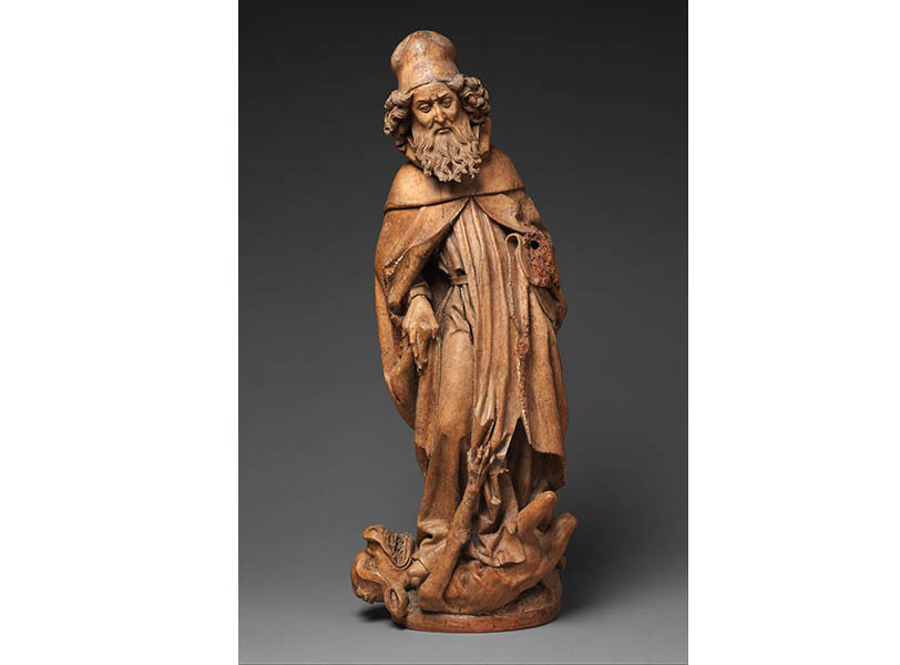 Gli Antoniani avevano due ospedali in Alsazia, a Isenheim e a Strasburgo, e questa figura intensa, espressiva e psicologicamente carica potrebbe essere stata realizzata per uno di loro. Scolpito a tutto tondo, potrebbe essere stato portato in processione e posto su un’edicola d’altare o su una mensola addossata a una colonna. L’eccezionale scultura del viso, della barba e dei capelli suggerisce la paternità di Nikolaus von Hagenau (1445 circa – morto prima del 1538), uno degli artisti dell’Alto Reno più dotati. L’opera è datata intorno al 1500.