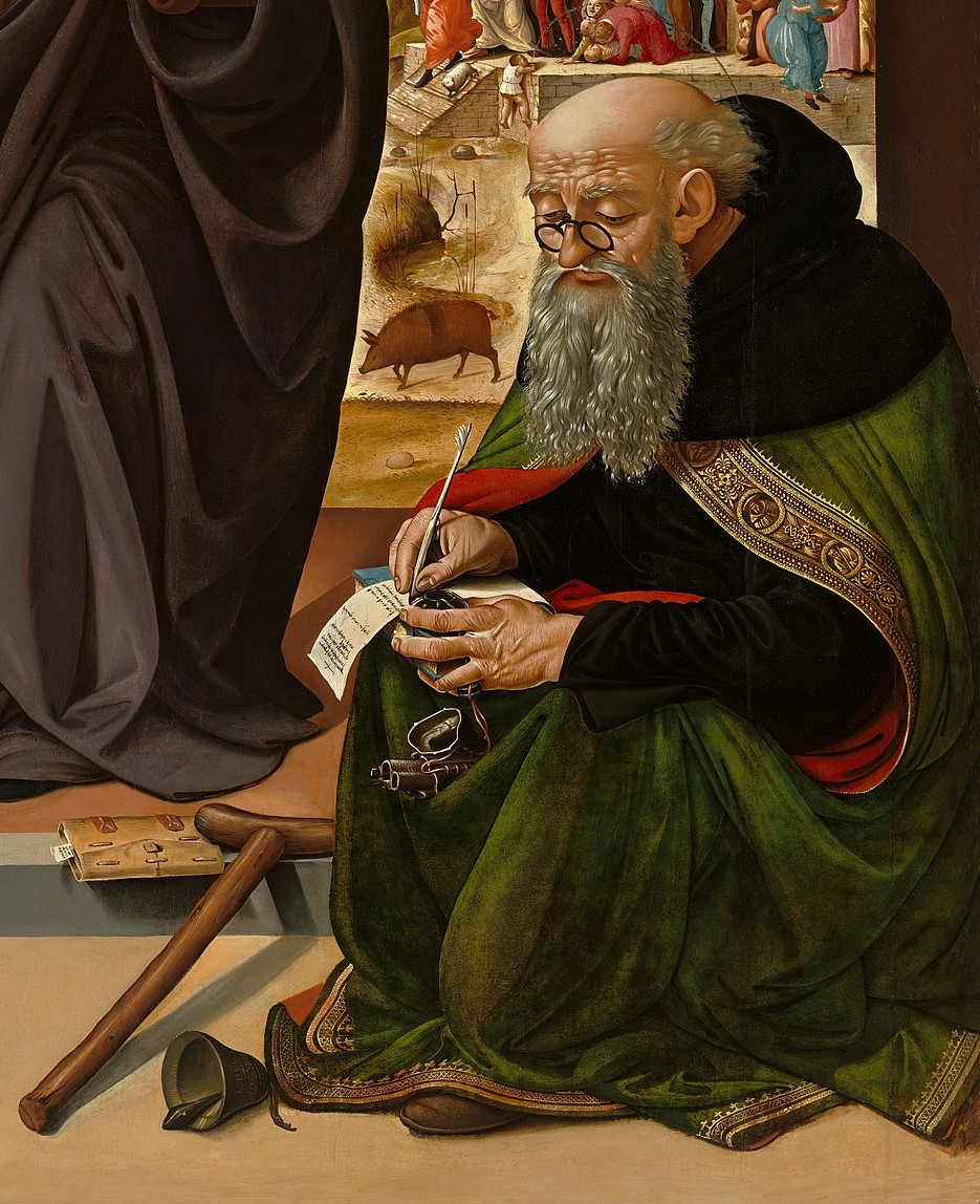 Ai lati, seduti, formando una composizione piramidale, si trovano i santi Nicola di Bari, a sinistra, riconoscibile per l’attributo delle palle d’oro, e Antonio abate, con la campana, il bastone a Tau e il maialino. Essi sono nell’atto di leggere e scrivere e sembrano fare da testimoni indiretti all’avvenimento; Antonio indossa anche un paio di occhiali di foggia tipica dell’epoca.