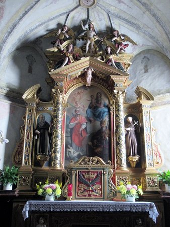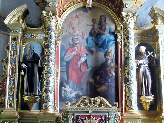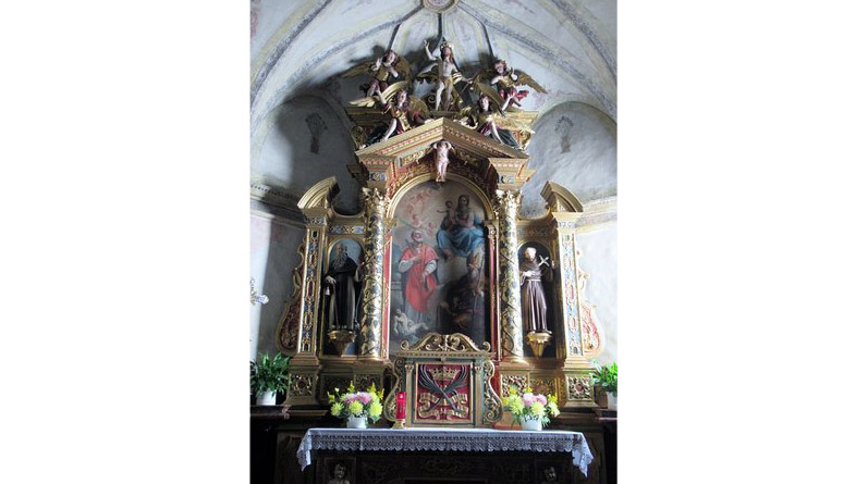 La pala centrale dell’altare è un’opera eseguita nel 1732 dall’artista veneziano Girolamo Brusaferro (1684 circa – 1760 circa) e illustra la Madonna con il Bambino e, in primo piano, San Nicolò e San Valentino.