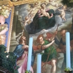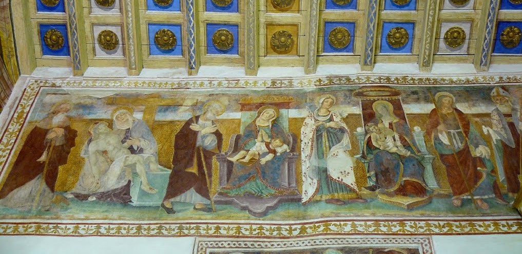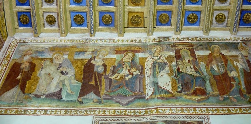 La parte alta della parete a nord della seconda campata è interamente riempita da un affresco raffigurante una trilogia di Madonne – due col Bambino e una Pietà – intervallate da figure di Santi. L’affresco è datato 25 ottobre 1522, l’autore è ignoto.