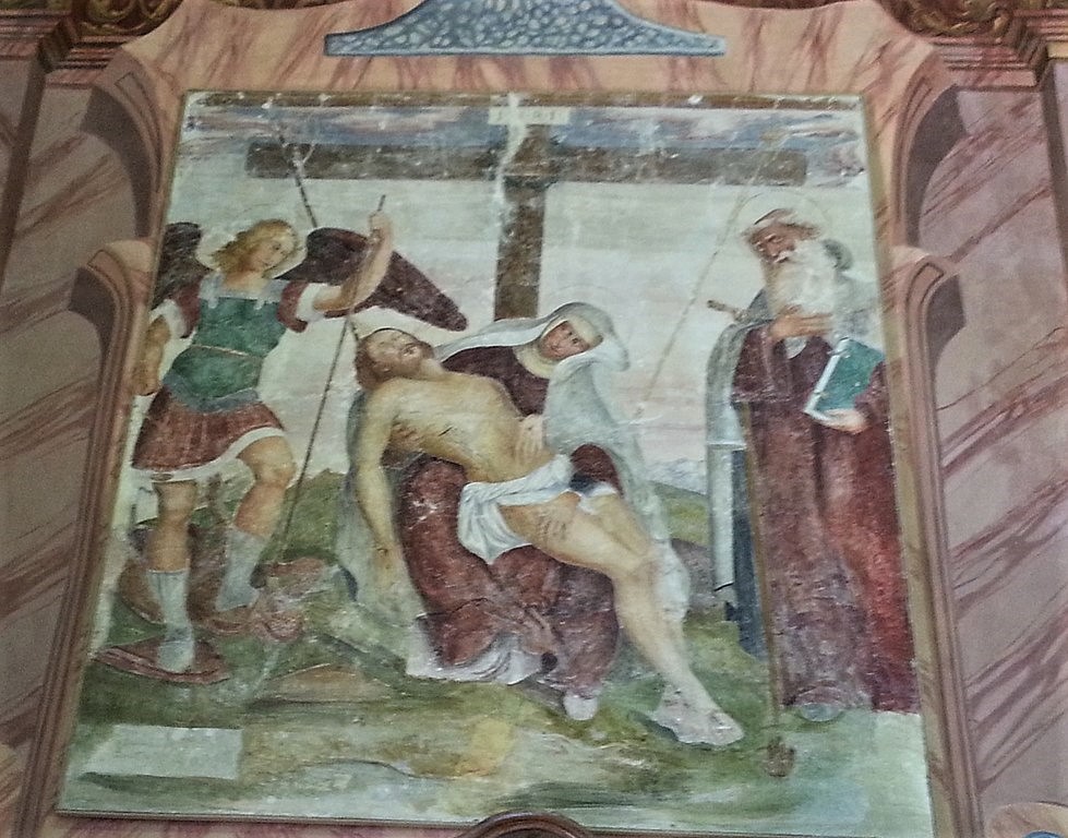 Un cartiglio, non più leggibile, datava 1536 l’affresco raffigurante la Pietà tra i santi Michele arcangelo e Antonio abate.