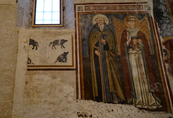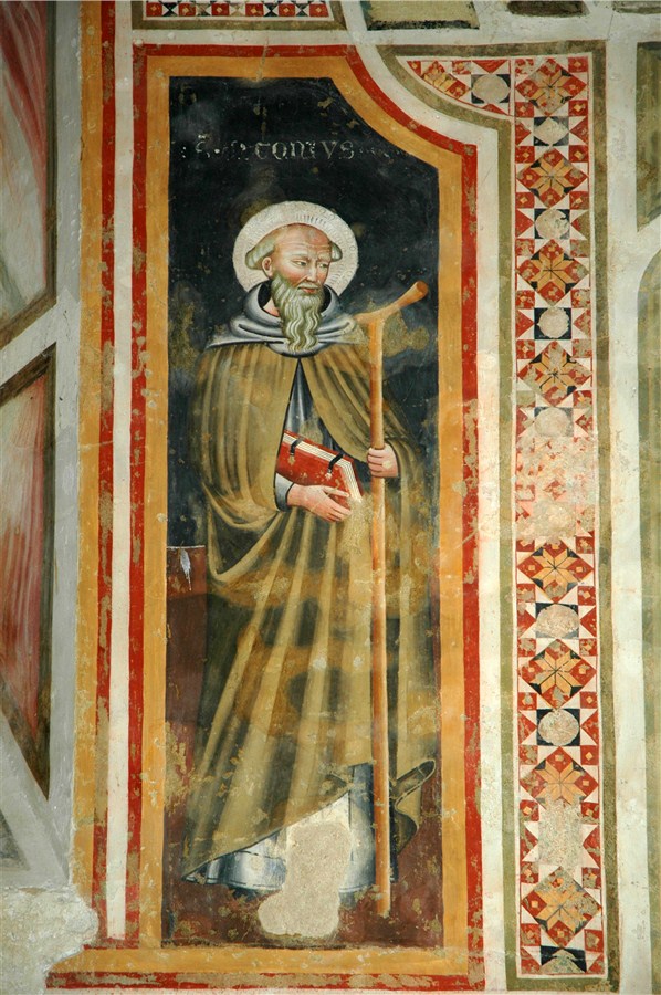 VALLO DI NERA (PG). Chiesa di Santa Maria, affreschi con tre figure di s. Antonio abate, XV secolo