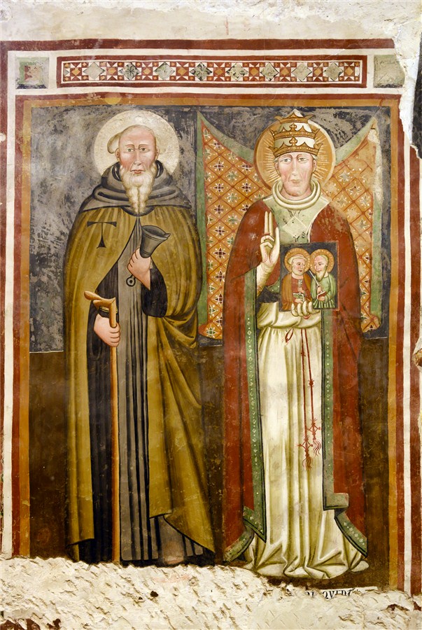 Sempre nella stessa parete destra,  ma a destra della seconda finestra, vi è un terzo s. Antonio abate con accanto sant’Urbano V (o s. Gregorio Magno), coronato col triregno, che mostra un dipinto con i Santi Pietro e Paolo. Figura in basso a sinistra.