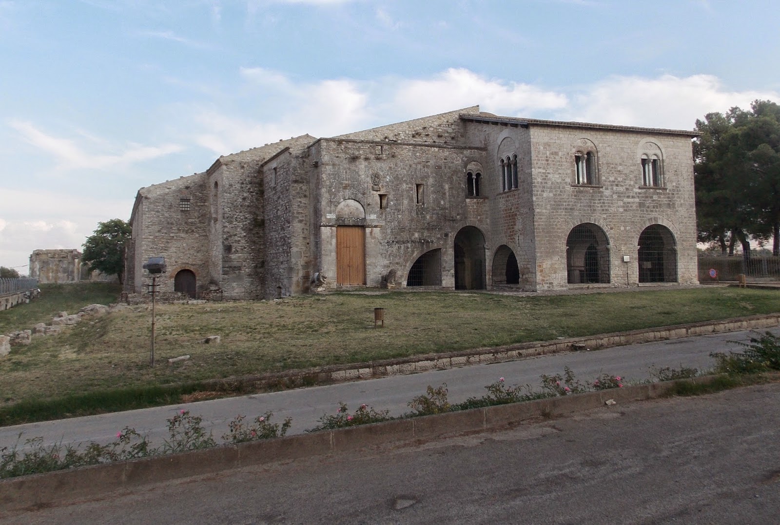 Il palazzo abbaziale, a destra della facciata della chiesa vecchia, è aperto a pianterreno da due arcate; al piano superiore i vari ambienti hanno finestre a bifora; una cappelletta è coperta da cupola di tipo musulmano. La chiesa nuova fu iniziata dietro l’abside della vecchia nel 1135, in forme romaniche di derivazione francese, utilizzando materiale del vicino anfiteatro, di antiche chiese e delle catacombe ebraiche di età imperiale e altomedievale. Della grande costruzione, rimasta incompiuta, restano i muri perimetrali, le tre absidi, e nell’interno, progettato a tre navate con transetti absidati e presbiterio cinto da deambulatorio secondo il modello delle «chiese dei pellegrini», il colonnato di destra della navata mediana. Accanto alla chiesa nuova sono tracce dell’antico Battistero paleocristiano del V secolo.
