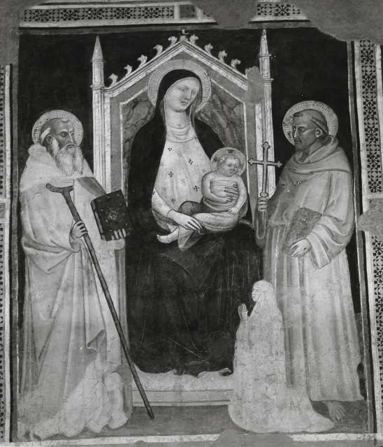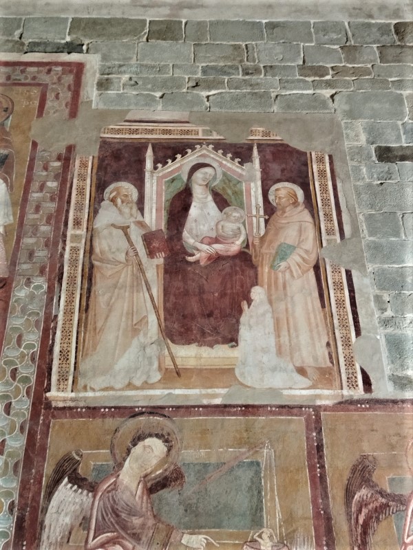 Sulla parete sud (immagine in alto), tra affreschi duecenteschi, vi è un dipinto murale che raffigura: “Madonna con Bambino in trono tra sant’Antonio abate e san Francesco d’Assisi