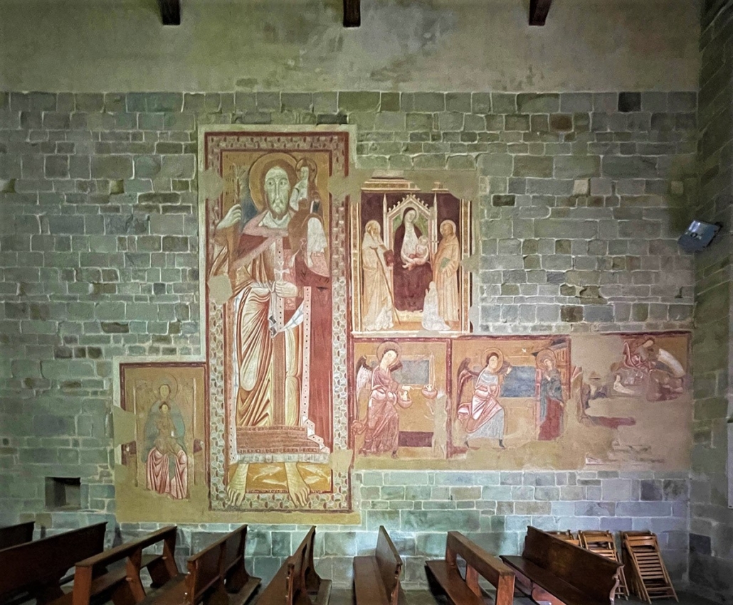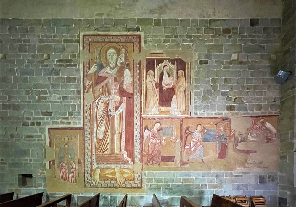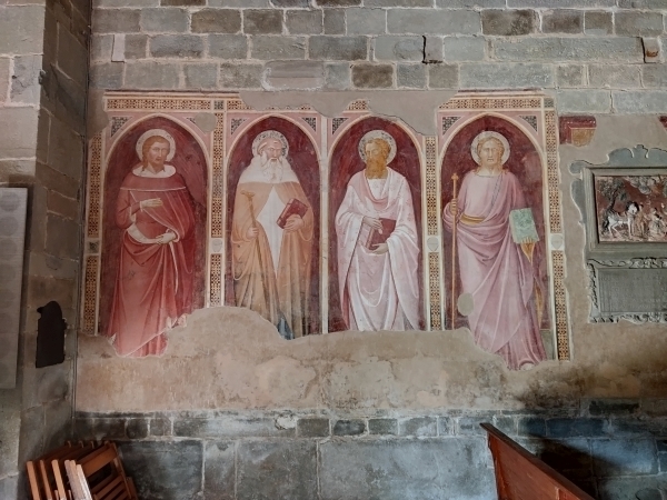 Sulla parete nord, una raffinata serie di quattro Santi, della fine del Trecento, il secondo da sinistra è sant’Antonio abate con saio chiaro, mantello, barba bianca, libro e bastone a tau.