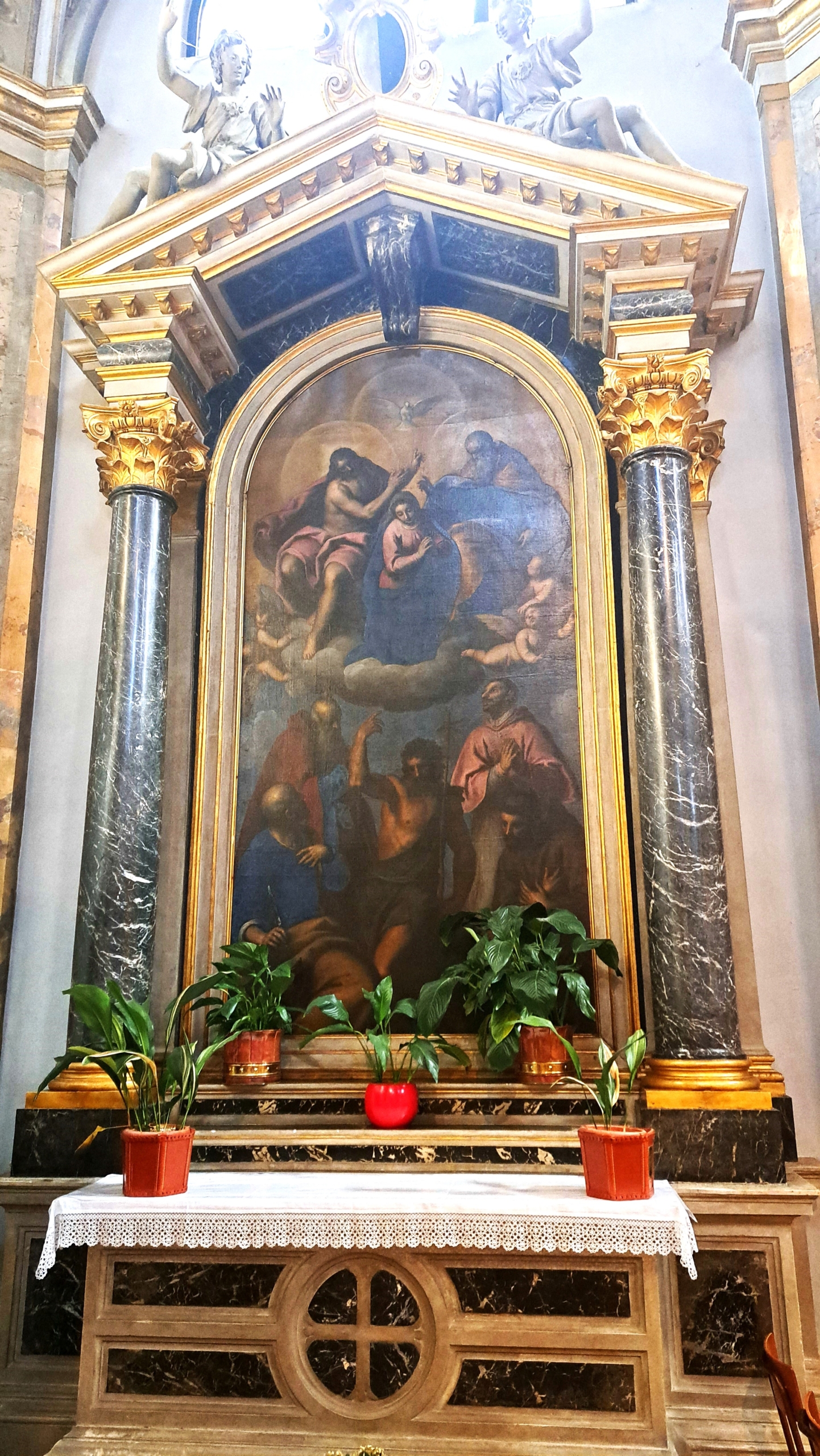 Posta sull’altare a destra dell’ingresso principale, intitolato da tempo a S. Giovanni battista e innalzato dalla contessa Camilla Calcia vedova di Emilio Trissino, in adempimento dell’ultima volontà del consorte, espressa nel testamento del 26 febbraio 1606.