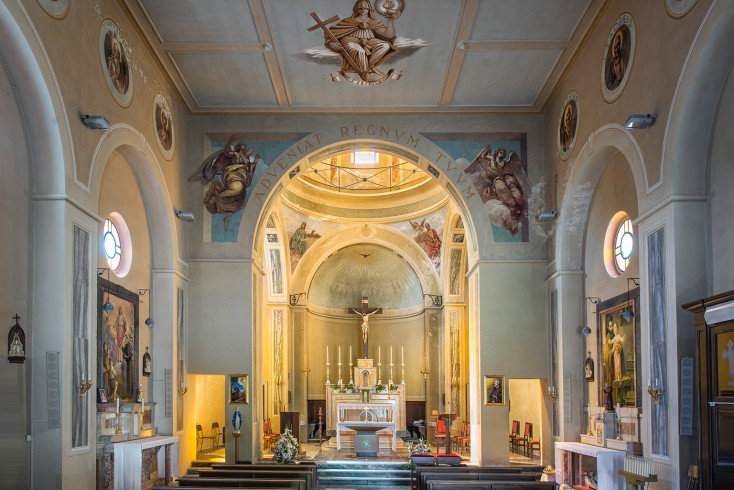 Su ciascuna delle due pareti laterali della navata, al di sopra di tre finestrelle circolari, compaiono dodici tondi affrescati che rappresentano gli Apostoli.