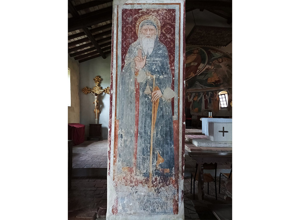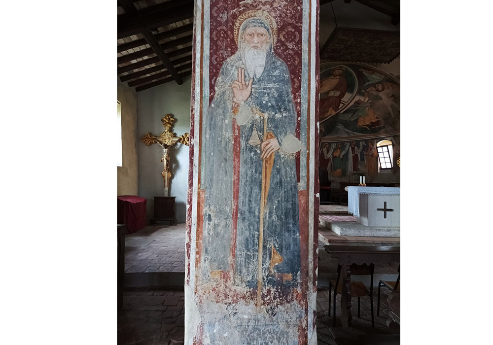 Sui pilastri vi sono molti affreschi devozionali con figure di Santi e tra essi anche sant’Antonio abate che indossa saio e mantello, ha la barba bianca biforcata e tiene la mano destra nel gesto di benedizione, con la sinistra regge un bastone con terminazione a “L” cui è appesa una campanella.