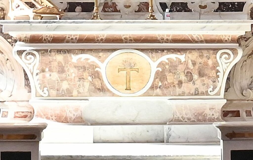 L’altare maggiore, in marmo di Carrara, degli inizi del secolo XVIII ha tarsie policrome e al centro un clipeo rappresenta una Tau sormontata da una fiamma.