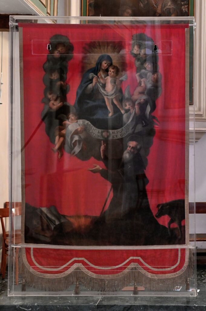 Un Gonfalone seicentesco ha la particolarità di essere dipinto da entrambe le parti con lo stesso soggetto a specchio e raffigura il Santo, nella sua classica iconografia, con il maiale e il bastone a T e in alto la Vergine col Bambino tra angeli. Il gonfalone è dipinto a olio su seta damascata.