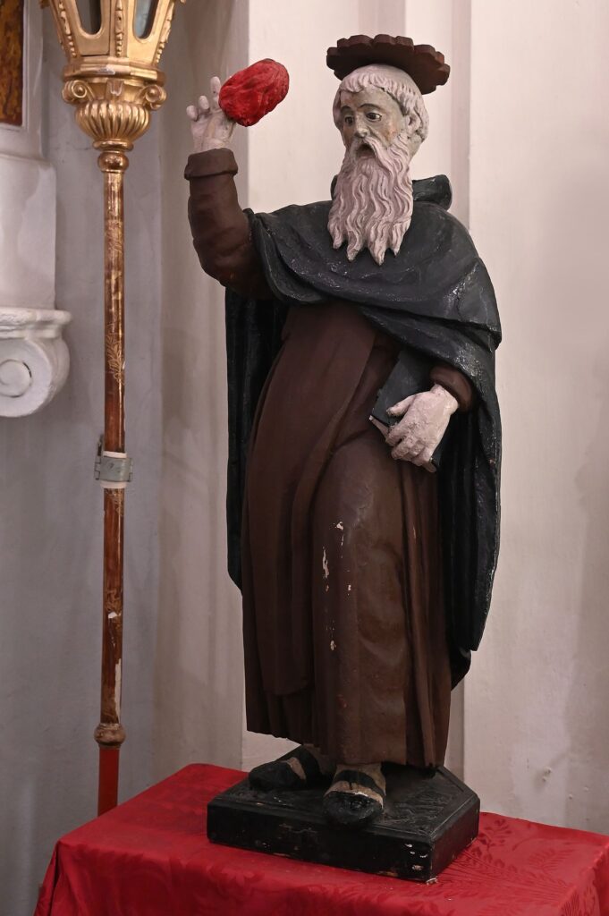 Il Santo ha un libro nella mano sinistra e tiene un fuoco sul pollice destro.